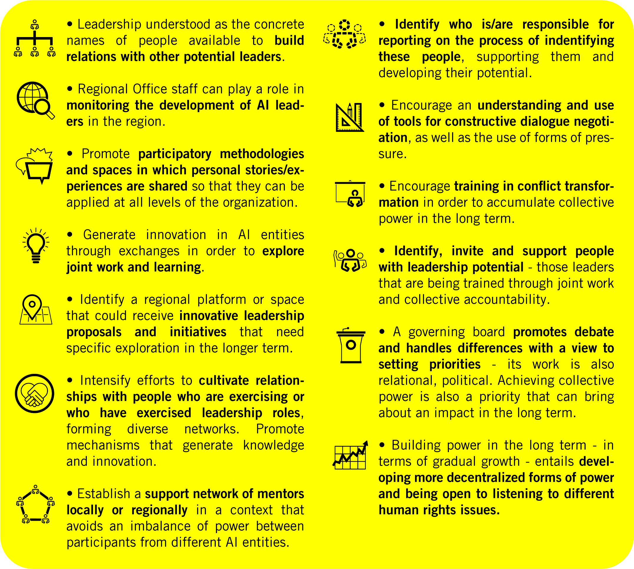 These key conclusions on how leadership is being developed in the region can clearly be seen both internally and in the relationships between the organization’s leaders and different actors in the community and civil society of which AI forms a part. The importance of relationships between leaders, the ability to connect stories and experiences of leadership, the promotion of debates and the need for accountability are all in keeping with the specific proposals for organizational and individual practices that have been included in this work. The complete document includes 16 general organizational proposals as well as more than 100 specific organizational practices encapsulated in the following nine areas of leadership, as identified in the opinions and experiences of leaders from the region: