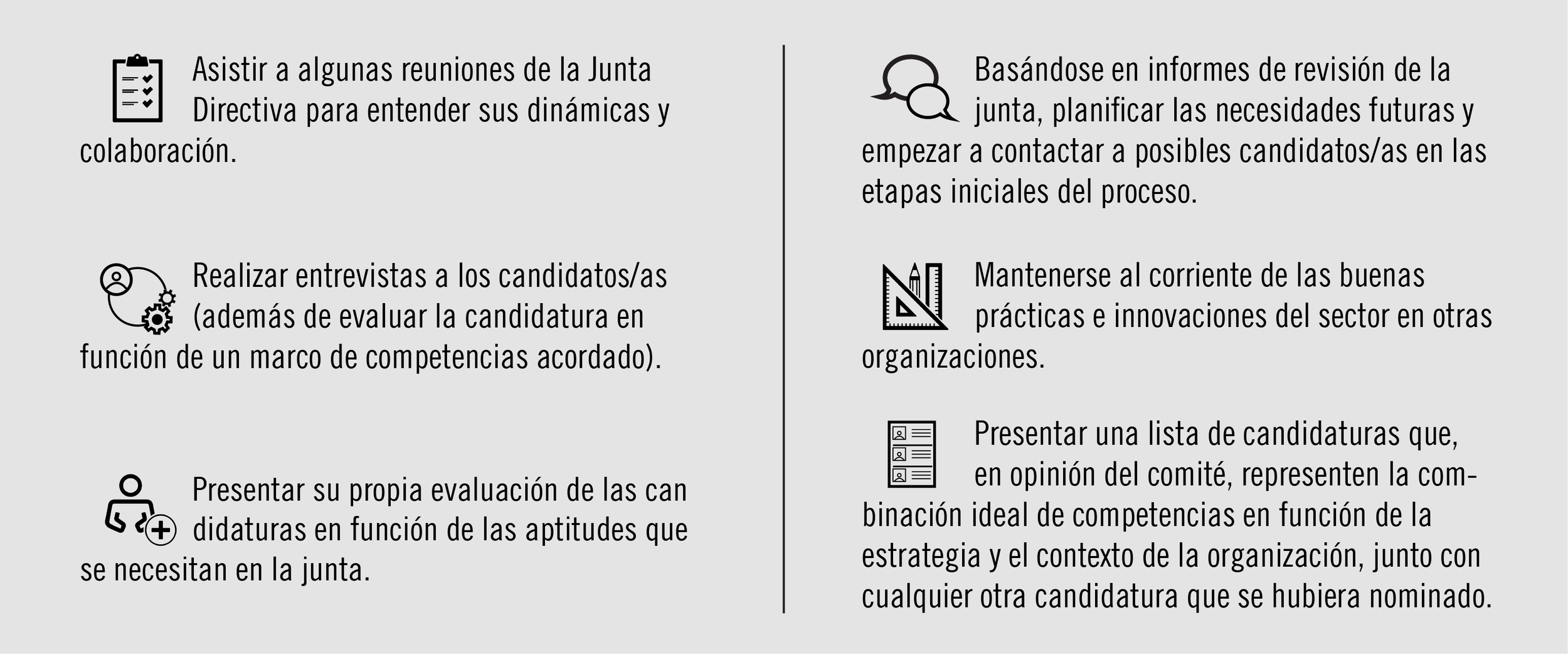 Cada Comité de Candidaturas debe adaptarse a su contexto organizativo específico y debe realizar las siguientes funciones principales: