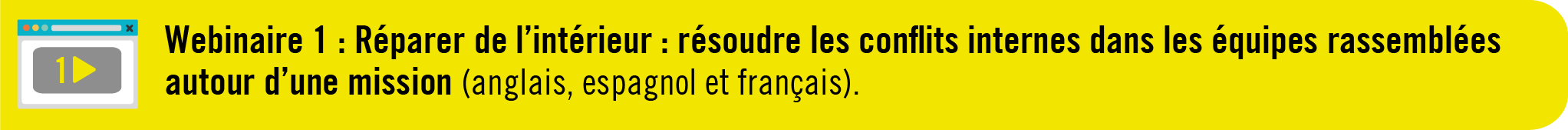En octobre et novembre 2025, le programme de renforcement du mouvement du Secrétariat international a offert une série de webinaires sur les compétences et les principes d'une bonne gestion des conflits. Les cinq webinaires couvraient chacun un sujet distinct et étaient animés par des membres de la liste des praticiens externes en résolution de conflits. Veuillez cliquer sur les liens ci-dessous pour voir les enregistrements, en notant que certaines sessions ne sont disponibles que de manière monolingue. Un résumé écrit des points clés de chaque webinaire est fourni en anglais, en espagnol et en français.