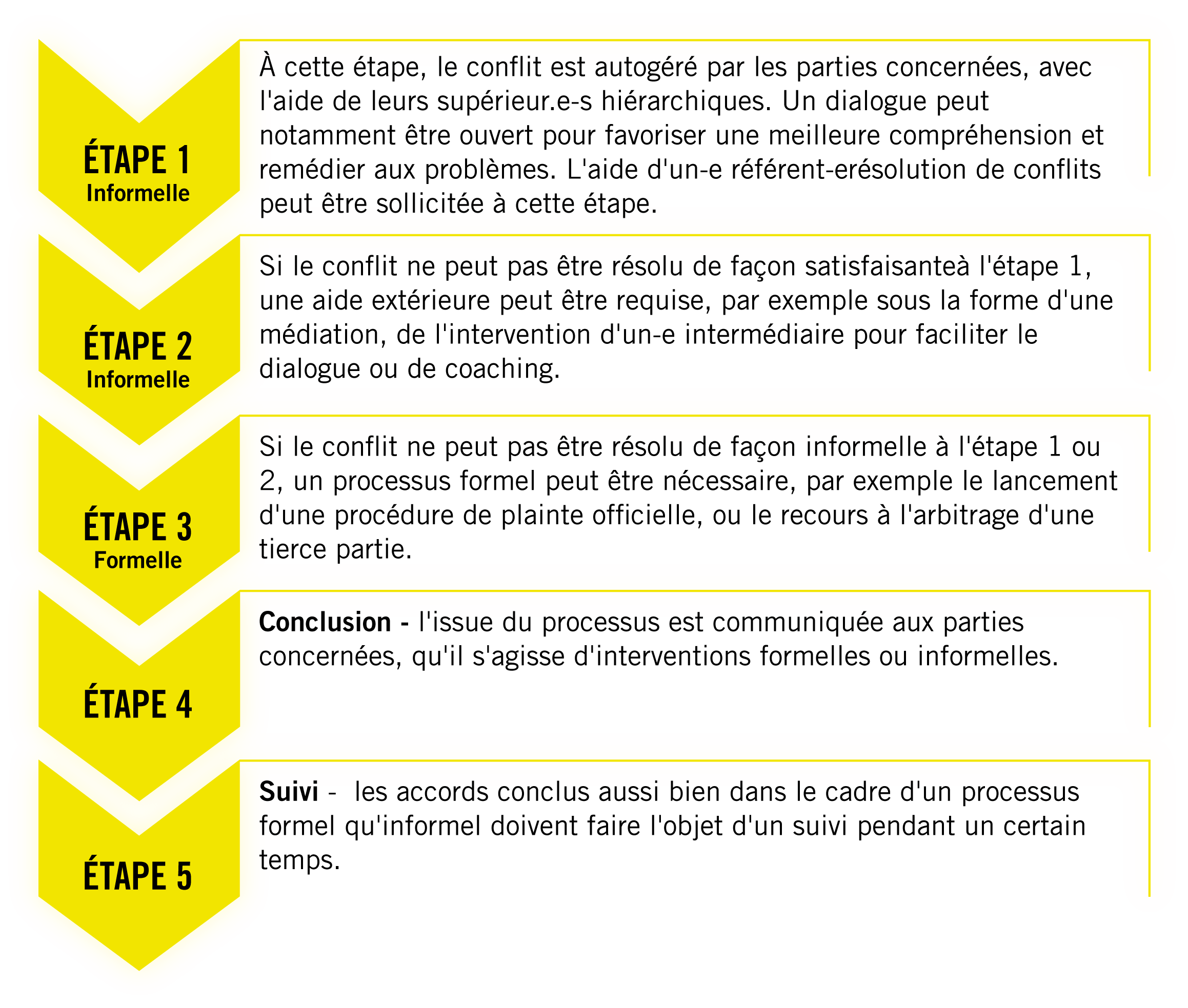 L’objectif du Processus de résolution des conflits est d’apporter de l’aide et des conseils à toutes les étapes du conflit.