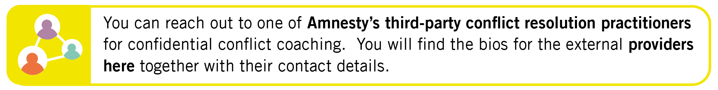 Amnesty’s Conflict Resolution Process aims to help address conflict in a fair, timely, and constructive way, from initial communication through to resolution and closure. It can be used for any internal conflicts between individuals or groups including: